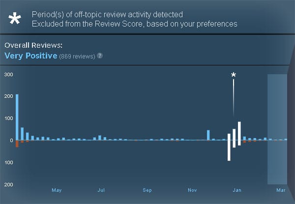 “Once our team has identified that the anomalous activity is an off-topic review bomb, we’ll mark the time period it encompasses and notify the developer. The reviews within that time period will then be removed from the Review Score calculation.”